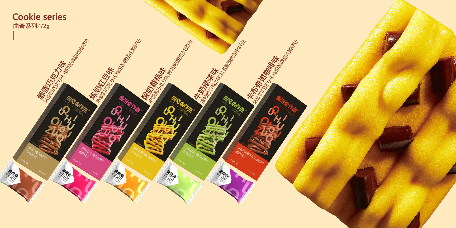 創(chuàng)新曲奇餅體拉絲技術(shù),添加優(yōu)質(zhì)香醇的進(jìn)口巧克力豆,像跳躍在線譜之間的音樂(lè)符,以“樂(lè)譜”形象打造香美客的獨(dú)特品類:音樂(lè)曲奇···